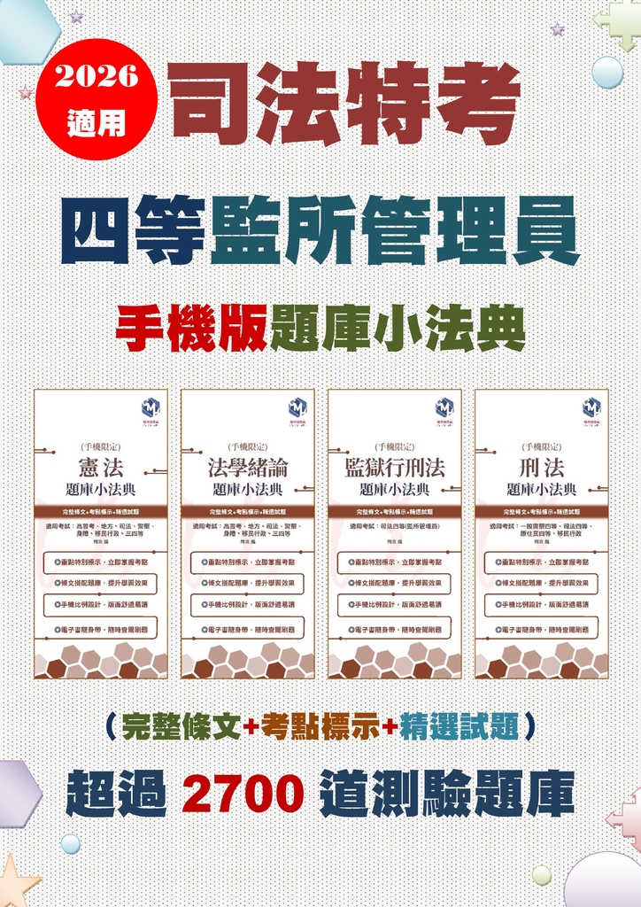 Are you sure you want to buy (2026年適用)監所管理員(四等司法特考)題庫小法典 again? This will generate duplicated items in your Library