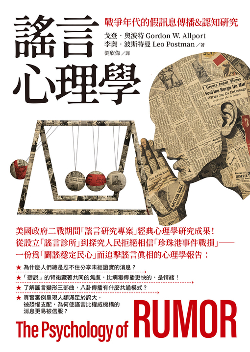 紙本書 謠言心理學:戰爭年代的假訊息傳播&認知研究 大寫出版 戈登.奧波特(Gordon W. Allport) 李奧.波斯特曼(Leo Postman) 謠言心理學:戰爭年代的假訊息傳播&認知研究 大寫出版 戈登.奧波特 On sale eBook NT$286 Printed book NT$379 Preview eBook DRM NT$286 Printed book NT$379
