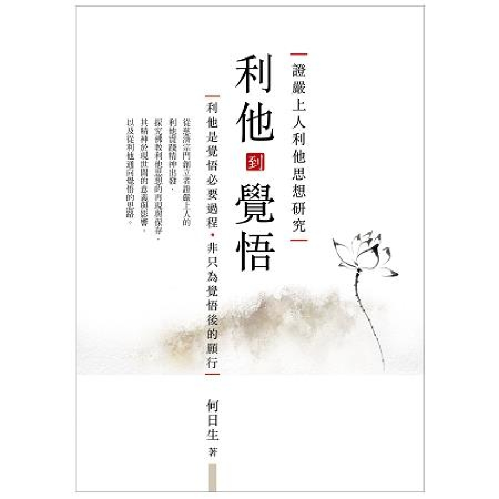 何日生《利他到覺悟:證嚴上人利他思想研究》一書,從慈濟宗門創立者證嚴上人的利他實踐精神出發,探究佛教利他思想的再現與保存,分析闡述慈濟宗門利他精神之要旨與從利他通向覺悟的思路,其實踐之體系之於對當代佛教及世界文明的影響。