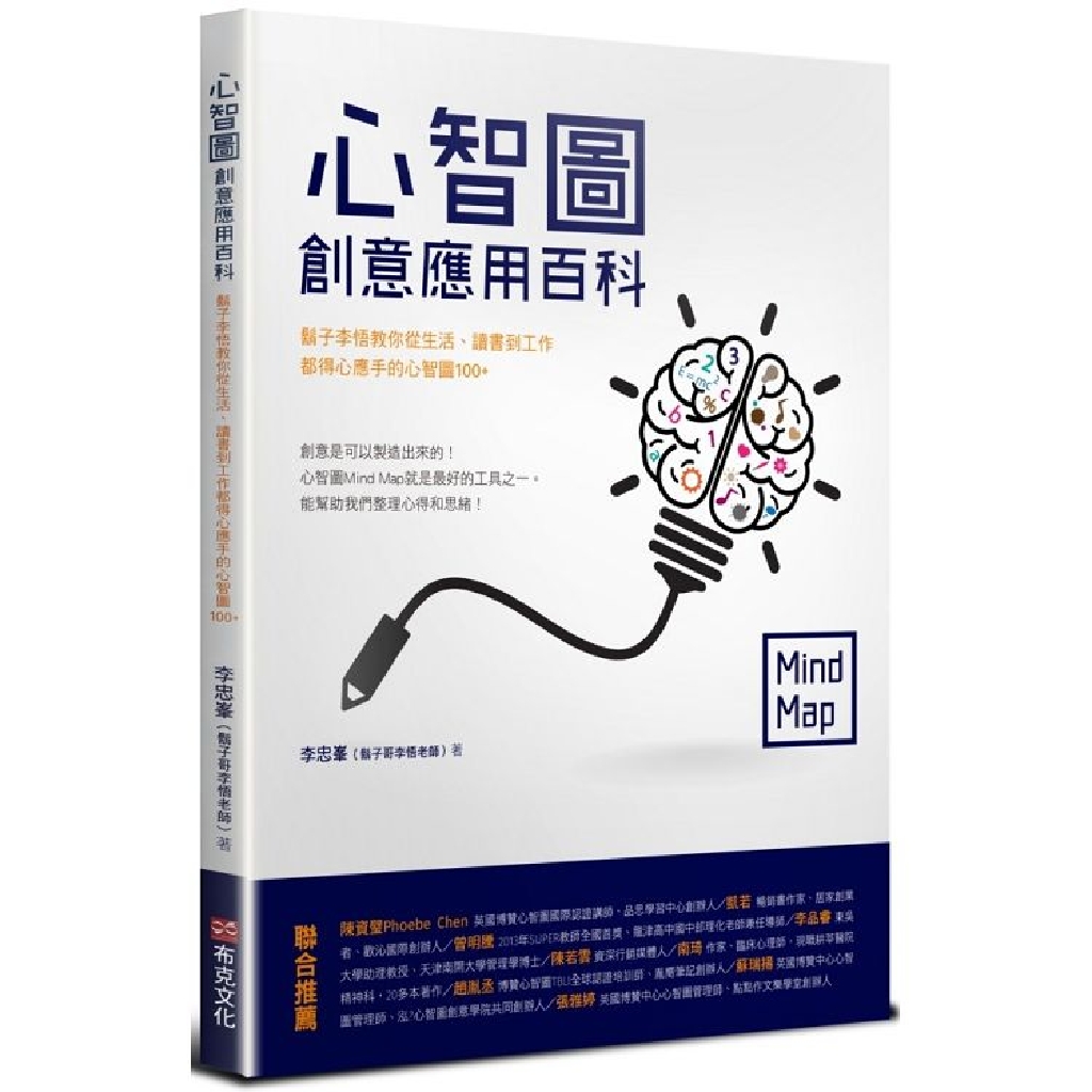 你可以不必照著書本裡的圖像來畫,畢竟心智圖講究的是個人思考延伸、個人創意等等,是個非常直觀且主觀的產物;但假設你願意參考筆者的思考脈絡以及表現技法,那麼本書倒是可以提供很多不一樣的角度!這就是為了達到「如何應用」而推出本書所費的苦心。"
