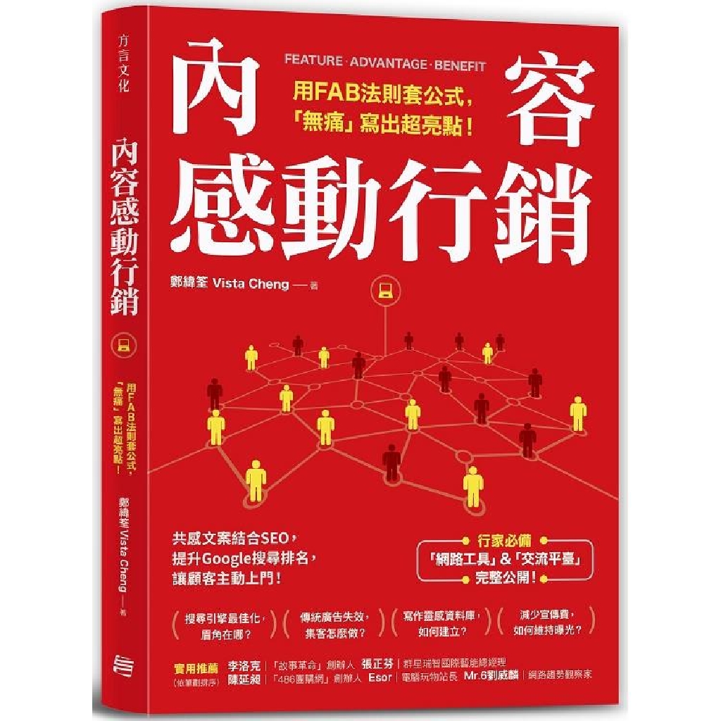 此外,書中更結合許多「搜尋引擎最佳化」(SEO)的眉角,包括網站載入速度的評估、訊息發布平臺與網域名稱的選擇、主題群集的設置等等,有效提升搜尋排名,教你做到全方位的內容行銷,成為掌握數位時代最大商機的「內容駭客」!