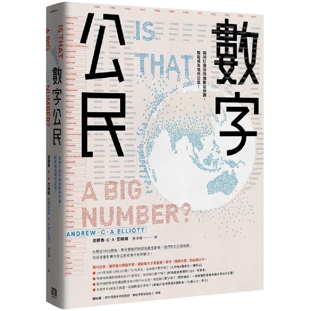 我們周圍充斥著驚人的數字:我們每天都會收到一堆統計數據,像是醫療成本、地震規模、最近的恆星離地球多遠、全球長頸鹿的數目等等。這些數字好像都很重要,其中有些特別重要,但我們未必清楚到底哪個意義重大、哪個看看就好,對於那些超過我們識字直覺、過大或過小的數字,我們根本無從判斷起,這讓我們心底感到隱隱不安。我們如何釐清這些數字究竟代表什麼?它們重要嗎?我們該擔心、興奮或覺得了不起嗎?