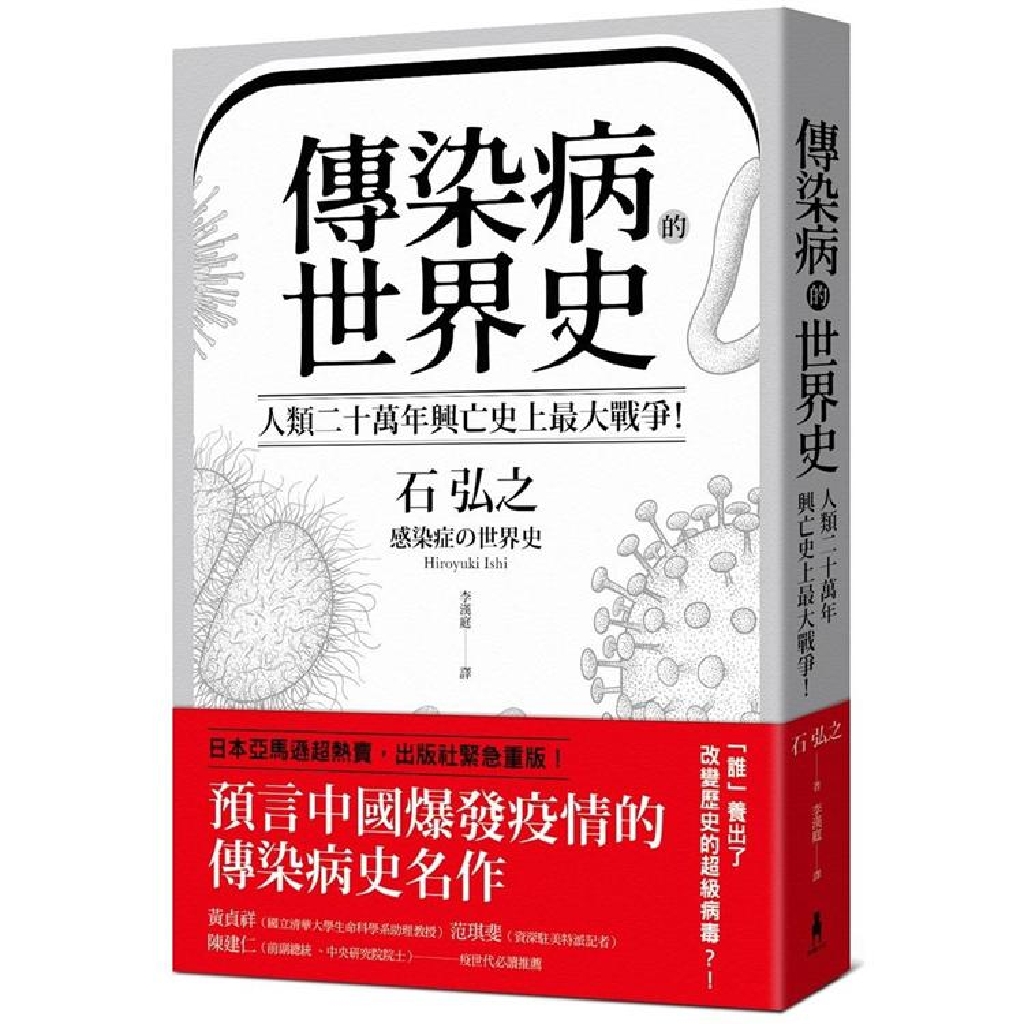 本書全名:傳染病的世界史:人類二十萬年興亡史上最大戰爭!從導致數十億人死亡、地球環境史上各種致命瘟疫,看國家文明、社會遭受流行病衝擊與變革的人類大歷史