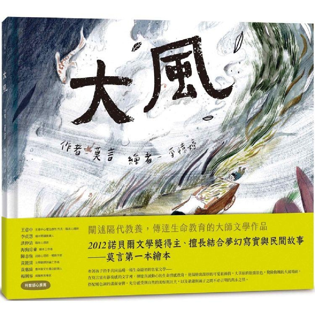 莫言擅長描繪大自然的寬闊氣魄與爽颯的人物姿態,他筆下的景色寫實且瑰麗。本書除了有動人又細緻布滿在生命回憶裡的爺孫之情,更與知名插畫家李憶婷合作,從沉靜的河堤草原之景,大風欲來的緊張感,再到風勢強勁人草魚滿天飛的刺激場面,運鏡精彩流暢,讓整部故事生動十足,有如看一場紙上的小小動畫,是一本適合親子或祖孫共讀的暖心之書。
