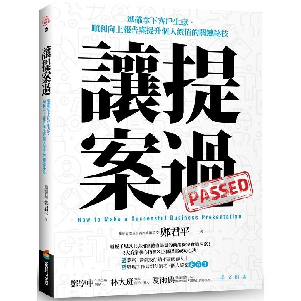 「此書有好的內容框架,好消化的文字配上在工作日常會見到的真實案例,變成好吸收的知識,細讀此書,一定能讓你的提案能力比別人多走好幾步。」