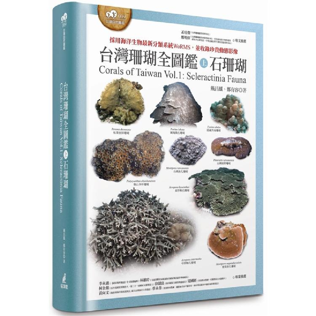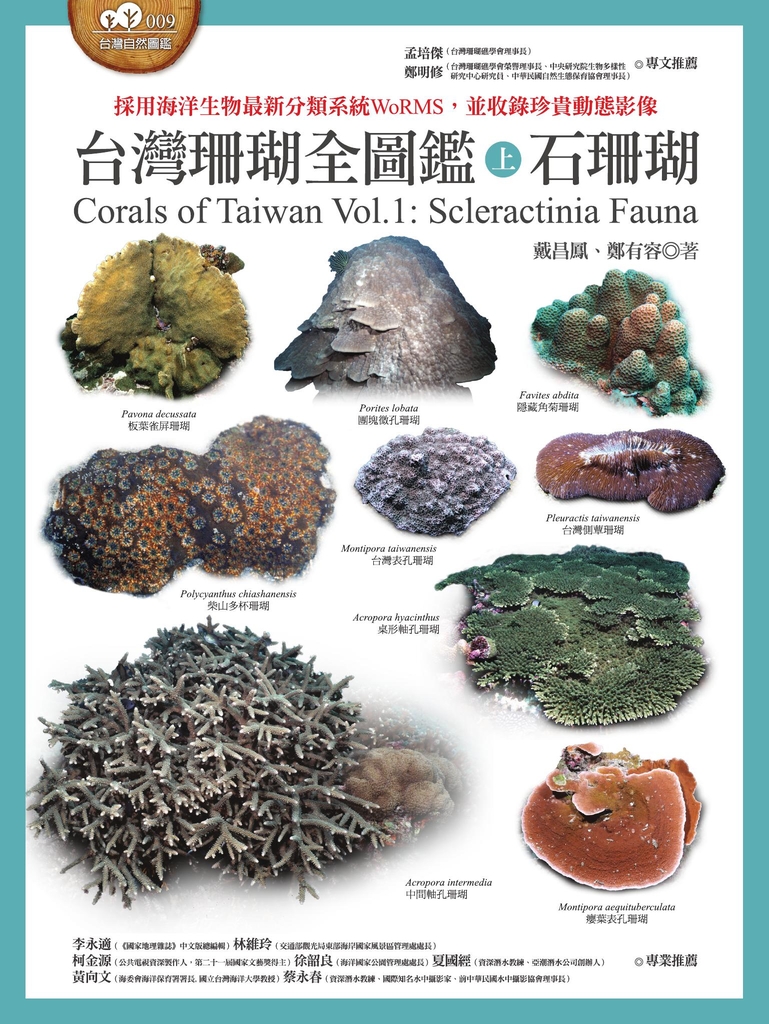 《台灣珊瑚全圖鑑》是目前物種清單最新的台灣珊瑚圖鑑,分上下兩卷,收錄了台灣周遭海域的全部珊瑚種類。上卷介紹所有的石珊瑚(造礁珊瑚),下卷收錄所有的八放珊瑚,共計49科824種。