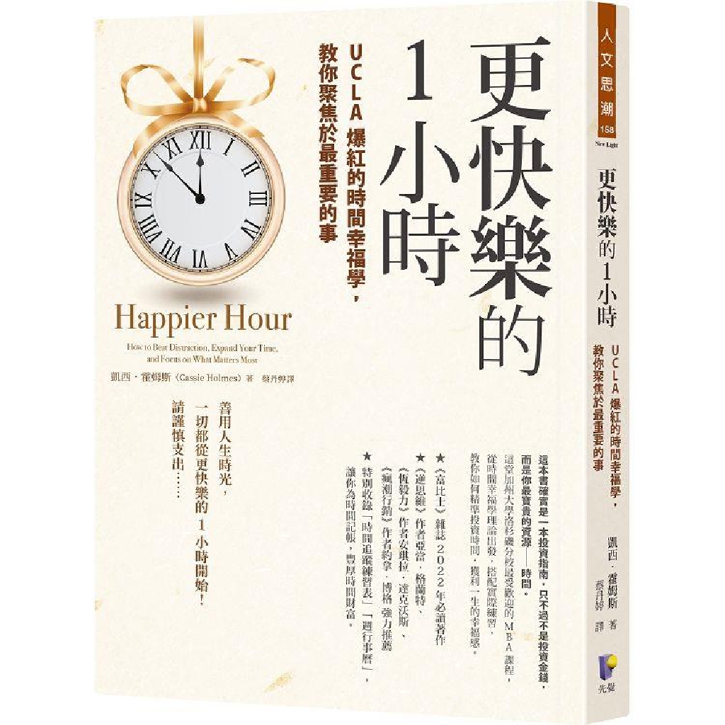 凱西.霍姆斯以研究時間和幸福而著名。她開的MBA課程「將快樂學應用於生活設計」,在加州大學洛杉磯校區大受歡迎,讓學生從中清楚意識到和父母、朋友、子女、寵物相處的珍貴時光。本書從這門課出發,穿插10幾道練習,並用投資的角度,指引你如何花用今天的每一小時,讓你在年年回顧時都能感到充實滿足,不會後悔虛擲時光。
