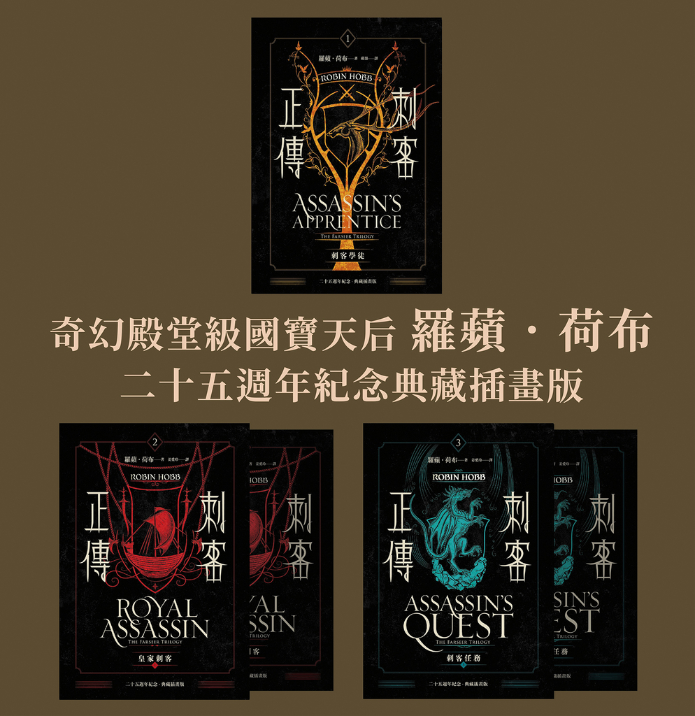 相關著作:《刺客正傳1:刺客學徒【二十五週年紀念.典藏插畫精裝版】》《刺客正傳2:皇家刺客(上)【二十五週年紀念.典藏插畫精裝版】》《刺客正傳2:皇家刺客(下)【二十五週年紀念.典藏插畫精裝版】》《刺客正傳3:刺客任務(上)最終部【二十五週年紀念.典藏插畫精裝版】》《刺客正傳3:刺客任務(下)最終部【二十五週年紀念.典藏插畫精裝版】》《雨野原傳奇4:巨龍之血(完結篇)》《雨野原傳奇3:巨龍高城》《刺客系列〈蜚滋與弄臣〉3刺客命運(上)》《刺客系列〈蜚滋與弄臣〉最終部3刺客命運(下)》《雨野原傳奇2:巨龍隱地》《雨野原傳奇1:巨龍守護者》《刺客後傳1弄臣任務.上(全新經典紀念版)》《刺客後傳1弄臣任務.下(全新經典紀念版)》《刺客後傳2黃金弄臣.上(全新經典紀念版)》《刺客後傳2黃金弄臣.下(全新經典紀念版)》《刺客後傳3弄臣命運.上(全新經典紀念版)》《刺客後傳3弄臣命運.下(全新經典紀念版)》