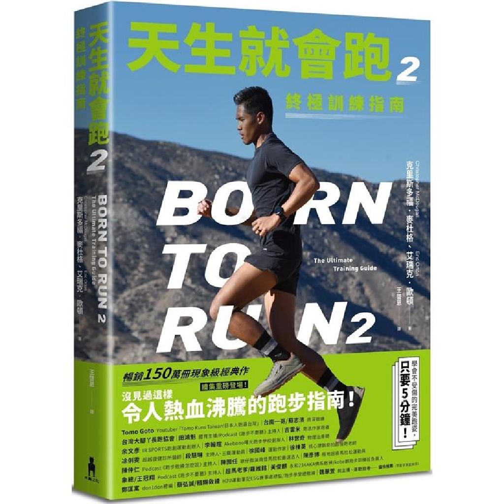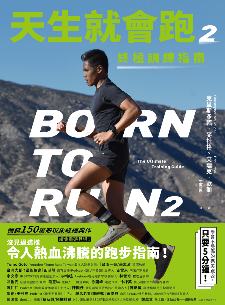 專業跑者克里斯多福.麥杜格與知名教練艾瑞克.歐頓,在《天生就會跑2》中,完整回答了從初階至中階跑者的所有問題,教導如何透過跑步,掌握人與生俱來的巨大能量。本書也是資深跑者全面的自我檢視清單,得以回顧各種訓練基礎與觀念,是否仍然正確支撐著自己的跑步生涯。