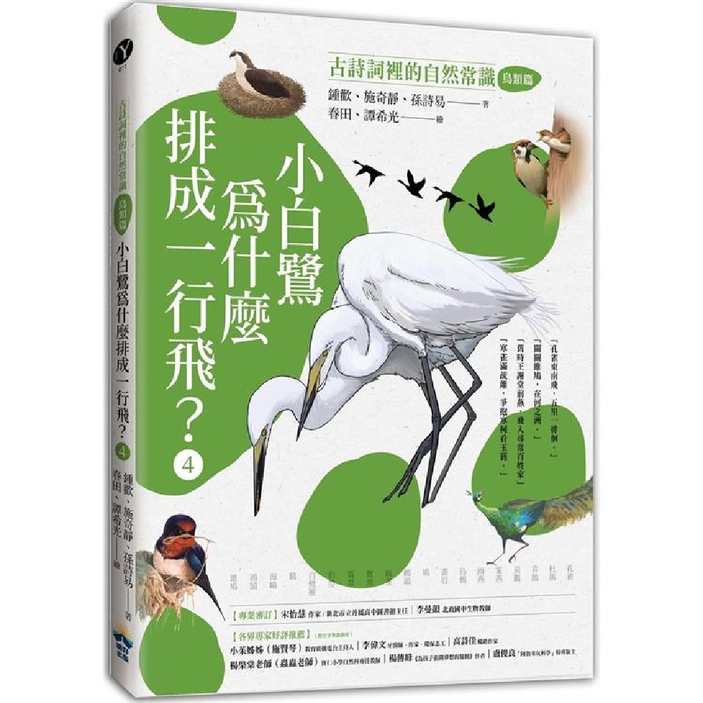 本冊透過古人的觀察,看見古詩詞中記載的鳥類生活。深入探索各種鳥類的日常與特殊習性,閱讀和鳥類相關的有趣故事。讓孩子對於生活在大自然中的鳥類有更深更廣的理解。每種鳥類都分為四大單元: