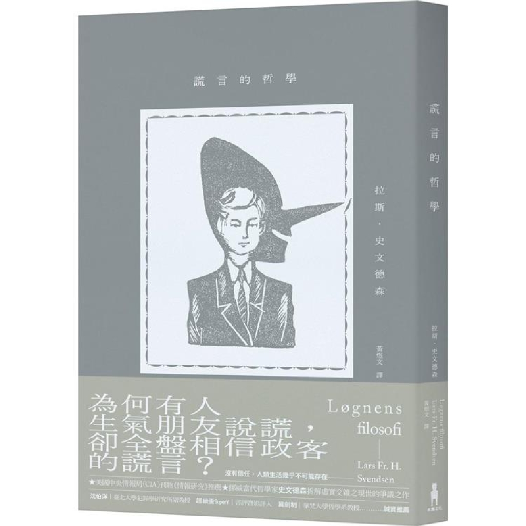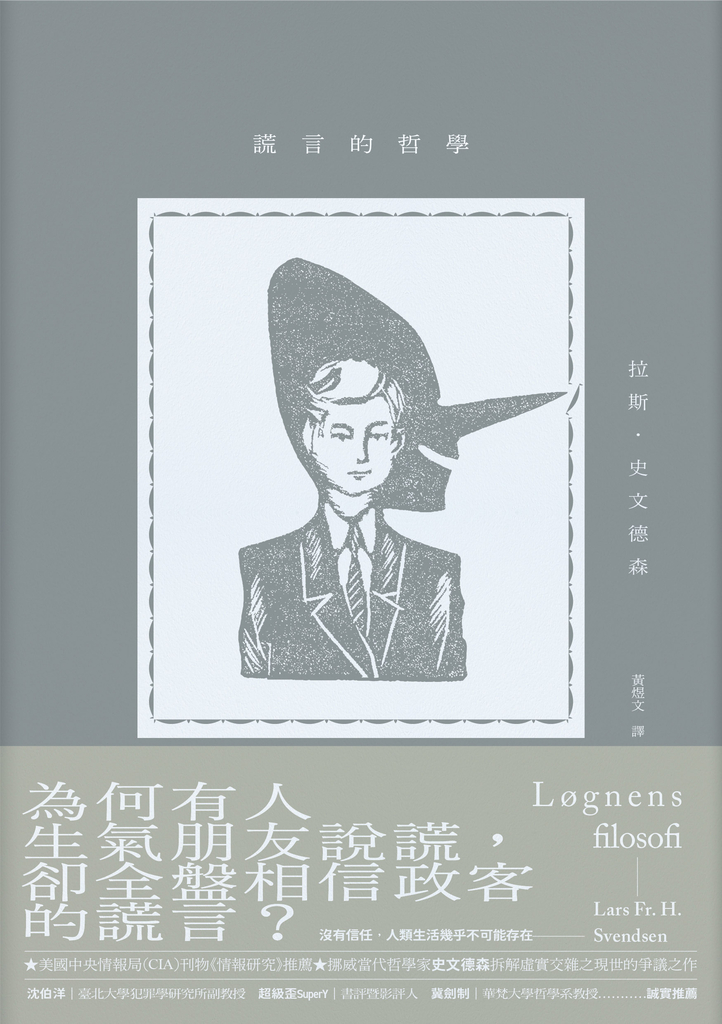 從自欺、對朋友說謊、對陌生人說謊,到政治謊言,挪威知名當代哲學家拉斯.史文德森全面性分析日常生活中的謊言。以哲學倫理為基礎,探究善意的謊言是否為必要之惡、信任對人類生存的意義,並從柏拉圖的「高貴謊言」理論到前美國總統川普的「巨大謊言」,權衡政治謊言中的弔詭之處,提供多重面向的思考: