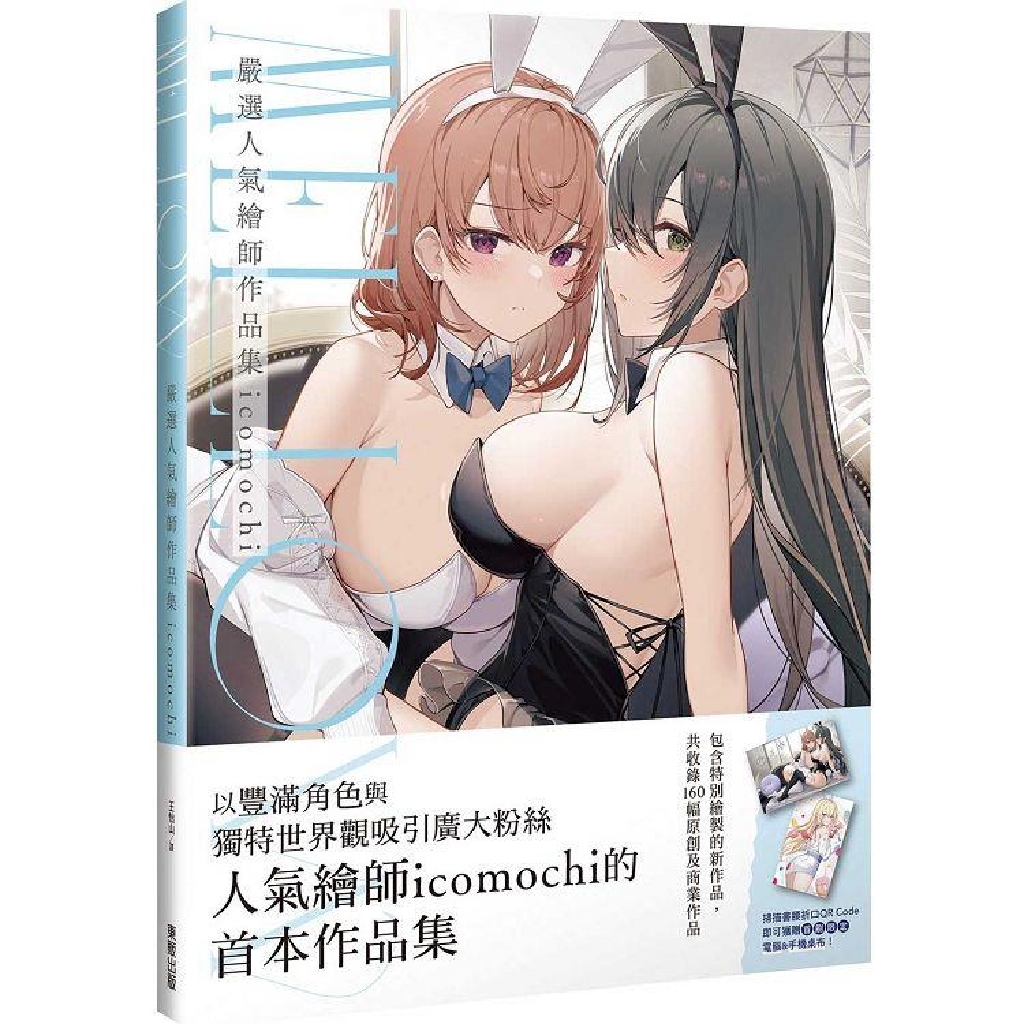 本書收錄了icomochi至今為止共160多幅商業和原創作品,商業作品包括輕小說《黑鳶的聖者》的插畫和遊戲《守望傳說》的主要角色設計等;原創作品則除了廣受歡迎的原創作品「黑兔女郎葵&白兔女郎夏芽」外,本書還收錄了特別繪製的5幅全新插圖。