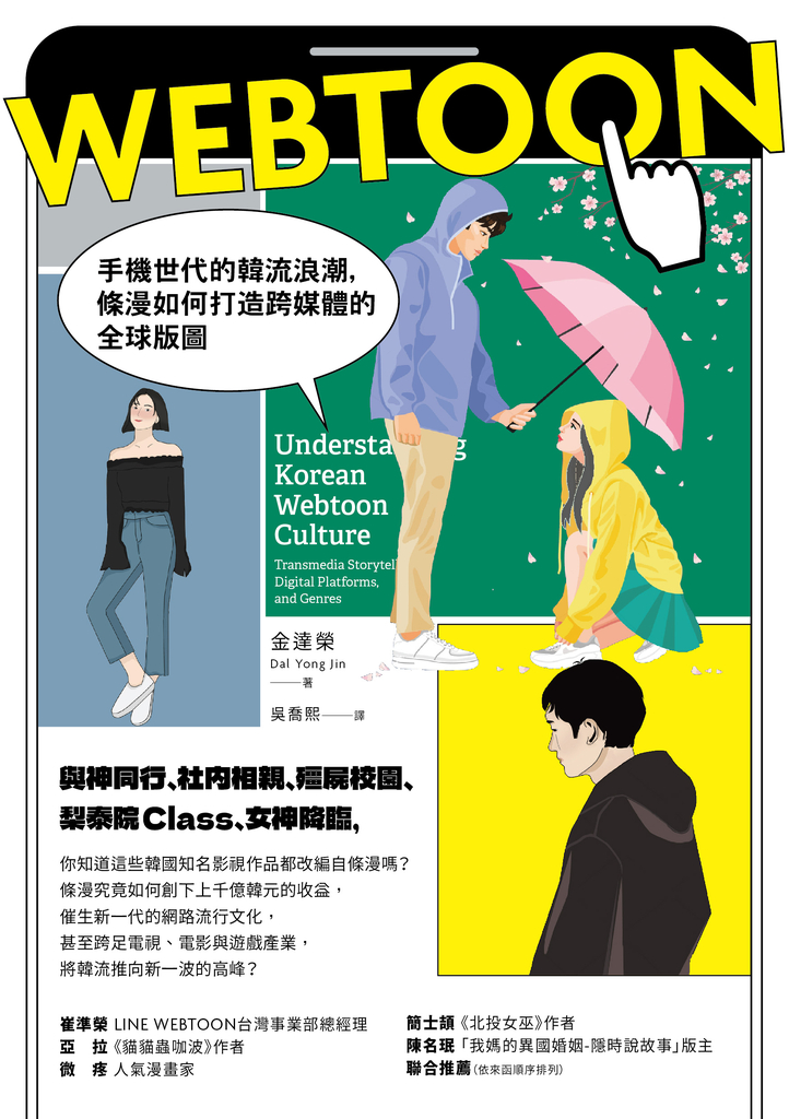作者陳達鏞教授將引領我們探索條漫的前世今生,如何成長為席捲全韓國、甚至全世界的娛樂風潮。由於條漫有別於傳統的紙本印刷漫畫,完全以數位的形式發行,隨著網際網路及智慧型手機等行動裝置的普及與發展,成為數位時代的新寵兒。