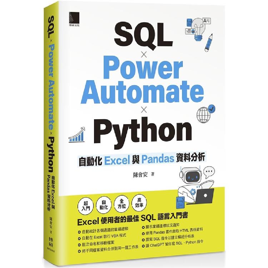 Excel 無所不能,但是功能操作繁雜。使用 SQL 語言,我們就只需要少少的程式碼來代替 Excel 功能,進行一系列的資料處理,包含排序、切割、篩選、合併、使用聚合函數、建立群組查詢,最後產生樞紐分析表。本書提供的 ChatGPT 提問模板,可以產生 SQL 及 Python 指令,幫助我們更快精通 Excel 與 Python 資料分析。