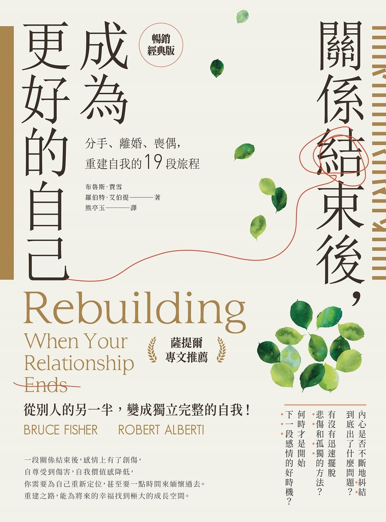 布魯斯.費雪的這本書可以引導人們度過關係結束後的一道道關卡。重要的是,心理重建需要時間,人們要給自己時間來喚醒內心中麻痺、壓抑或未知的部分。願每一位離婚人士都能擺脫失敗感,帶著希望走向生命的下一個階段。