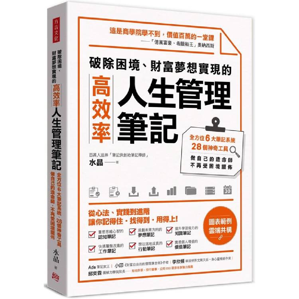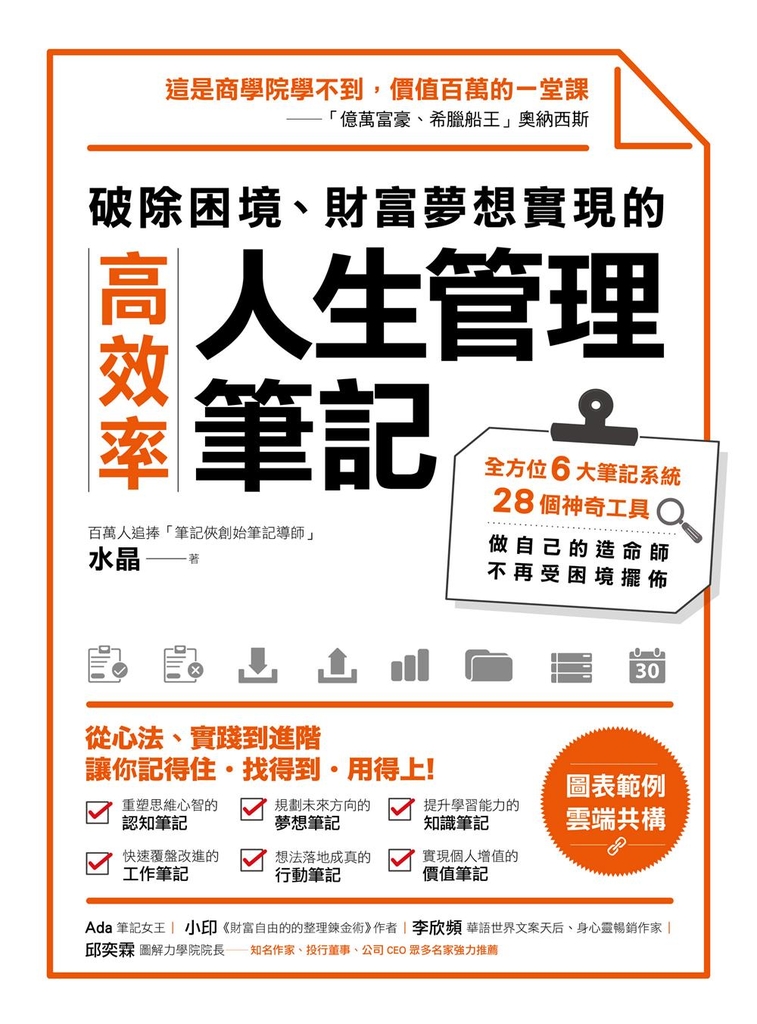 「如何在工作和生活中應用筆記?如何利用筆記提升自身能力?如何完善筆記實現心中的夢想?」經由本書,他分享使用多年的筆記方法和實用工具,這些清單將引導你從心法、實操到進階,一步一步走進筆記的世界,逐步成為筆記高手和高效人士,建立起一套個人成長系統。
