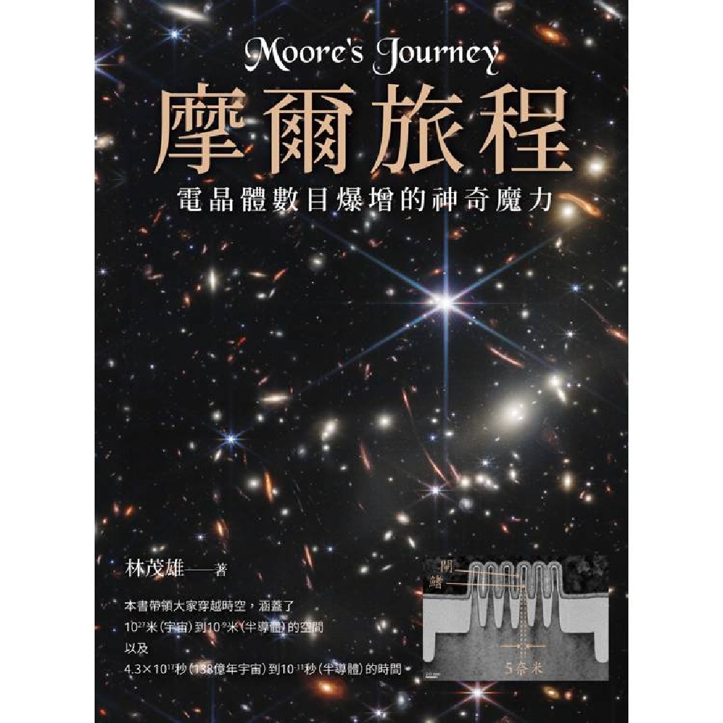 ◎ 將帶領你穿越時空,走進積體電路的摩爾旅程,由1958年含有2個3毫米大小電晶體的晶片,不斷微縮演進成今日含有5百億個3奈米大小電晶體的晶片;就好像穿越時空,宇宙由137億年前的一個小點,遵循著自然界的愛因斯坦廣義相對論不斷的膨脹,達到今日直徑一千兆兆(10的27次方)米且含有一百億兆(10的22次方)個恆星的規模。