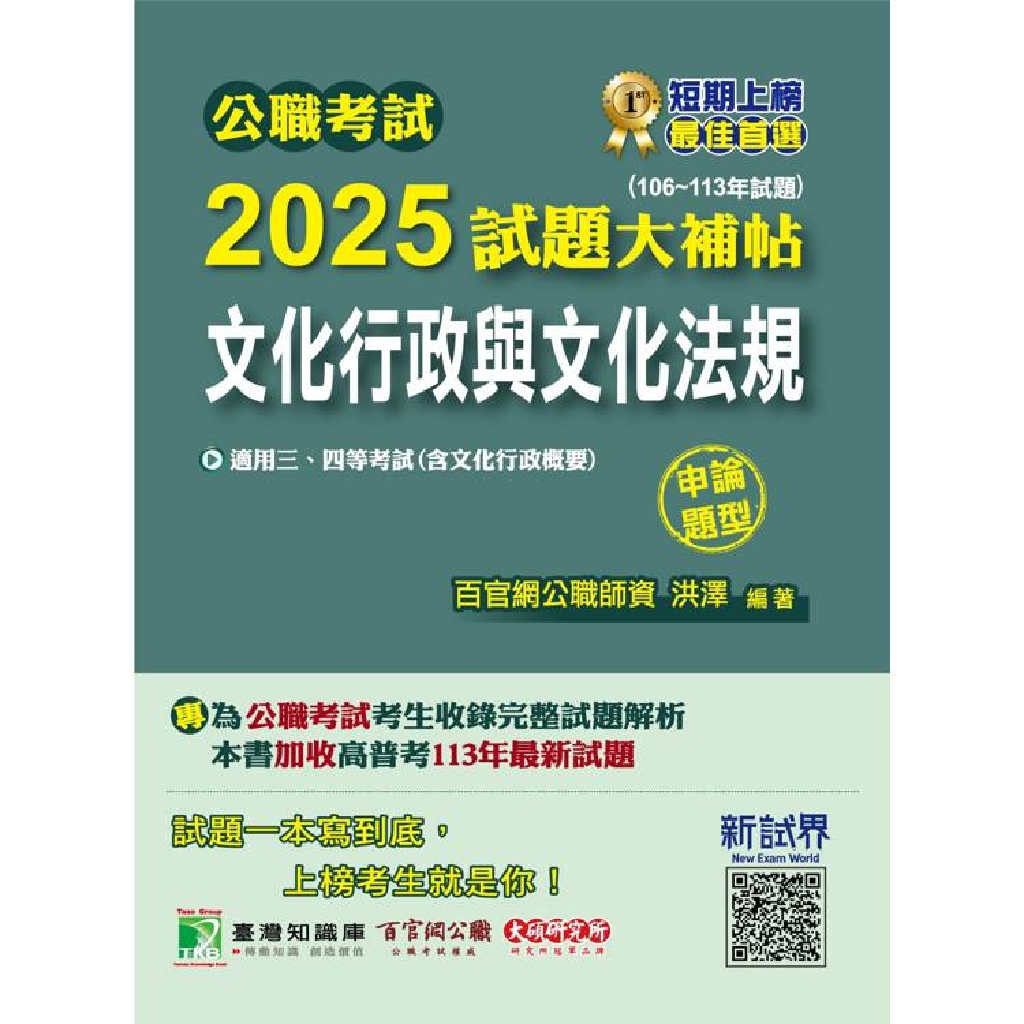 公職考試2025試題大補帖【文化行政與文化法規(含文化行政概要)】(106~113年試題)(申論題型)[適用三等、四等/高考、普考、地方特考](CK4101)