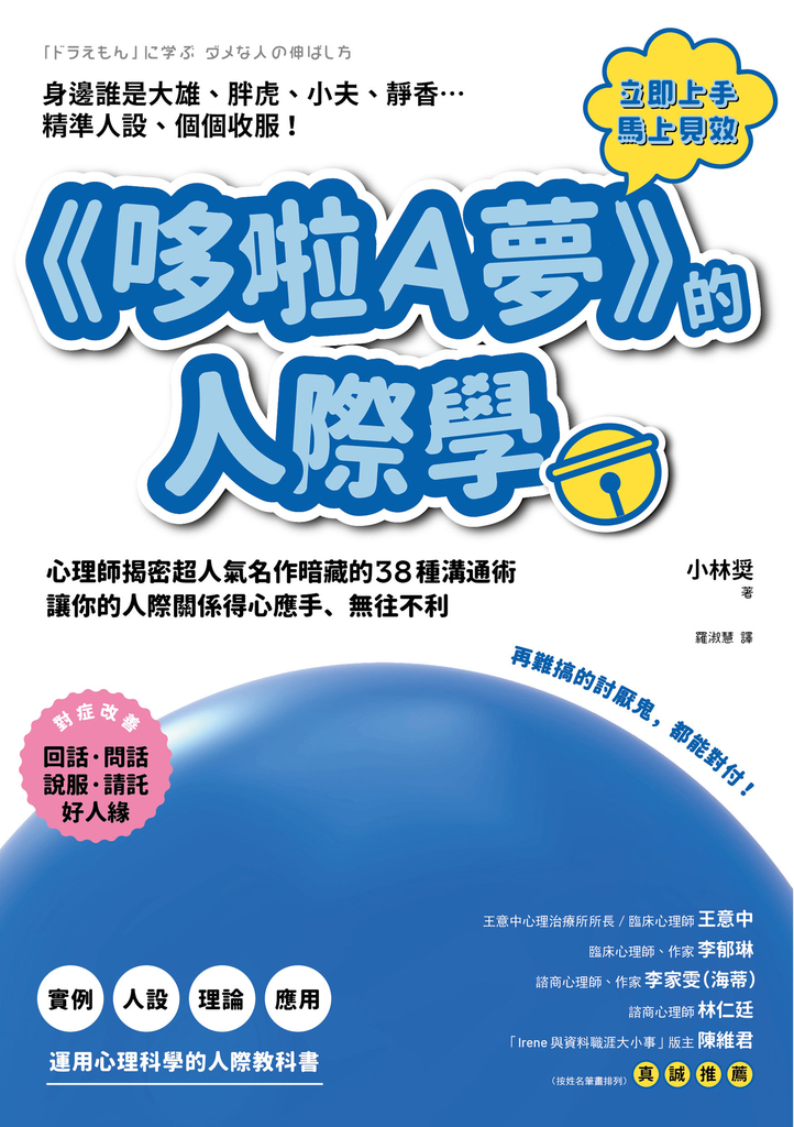 熟讀這本書,你將能輕易地「人設」自己身邊的任何人,是「大雄」、「胖虎」或者「小夫」、「靜香」等等,甚至是他們的綜合體。只要跟隨書中所提及的實例、理論和訣竅,很容易就可以快速找到最好的因應策略,從此再也不會手足無措,也不會因為搞錯方法而砸鍋壞事。