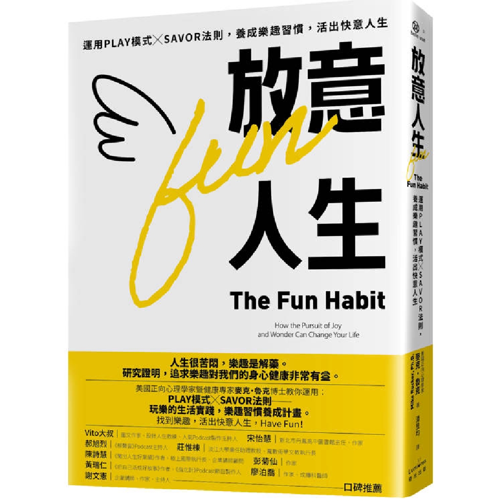 「當你讀完這本書,你會獲得清晰可信的科學證據,證明玩樂是維持生命有效且重要的元素。你還會學到策略技巧,以一種舒服明確的方式讓樂趣規律存在於生活中,不用勉強,不是虛假。這些技巧大大改善了我的幸福感,我也用這些技巧幫助他人得到好處。當我說不要再追求幸福,應該開始享受樂趣時,這些原則完全基於有嚴格評審的科學研究。我和我的團隊花了數年時間來驗證,你也會讀到這些想法和策略。我們都有能力過著更歡樂的人生,我們只是沒有合適的工具,這本書解決了這個問題。」