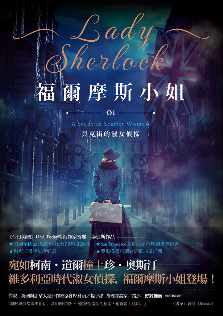 「福爾摩斯小姐」除了引人入勝的十九世紀風景、抽絲剝繭的精彩探案外,對那個時代生活細節、時尚流行的描寫皆字字珠璣,加上不時出現的機智幽默對話,就像柯南.道爾撞上了珍.奧斯汀,讓人不禁拍案叫絕。
