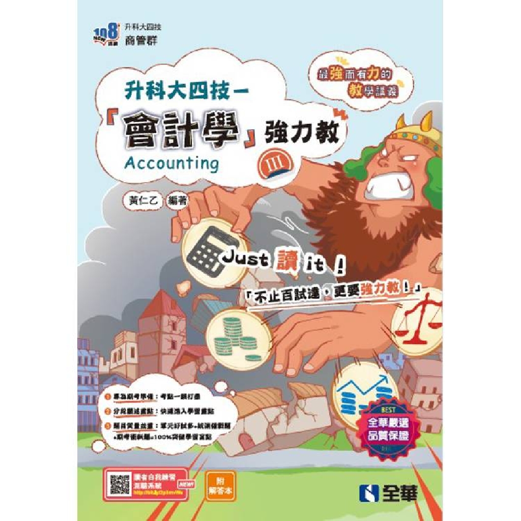 本書係依據108年最新公告會計學課綱教材編著整理而成。教材內容參照一般公認會計原則(國際財務報導準則IFRSs)、商業會計法及其他相關法規編寫而成,分III、IV二冊。本書搭配「重點一把抓」專欄,補充會計重要知識;題目涵蓋了基礎、進階、歷屆統測試題及綜合練習等多元題目,培養學生會計帳務處理能力及建立會計法規的正確觀念。