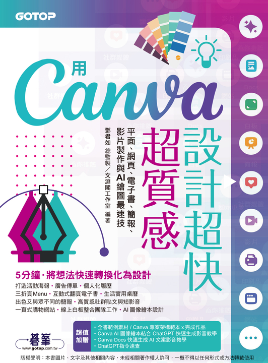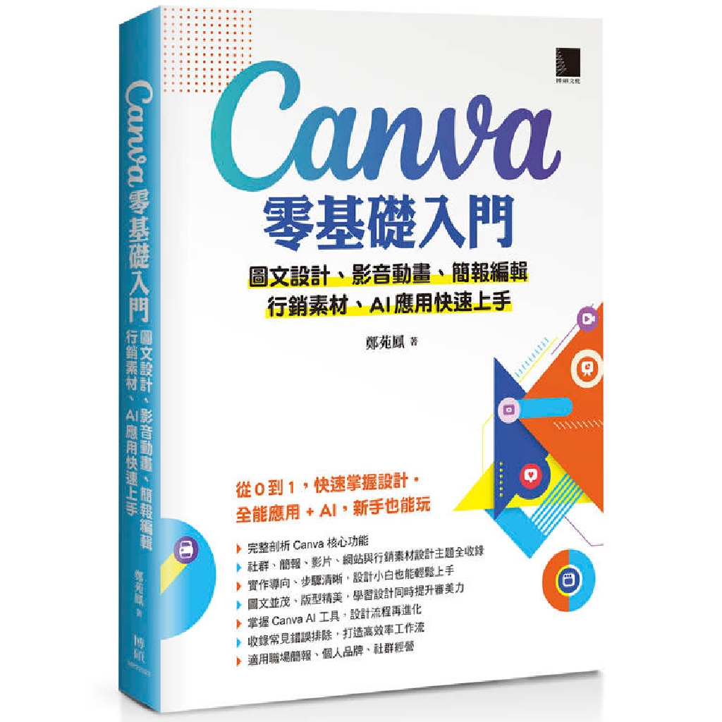 從帳戶註冊、範本選擇,到文字、圖像、動畫、影片、簡報、社群行銷設計,循序漸進,幫你打好設計根基。