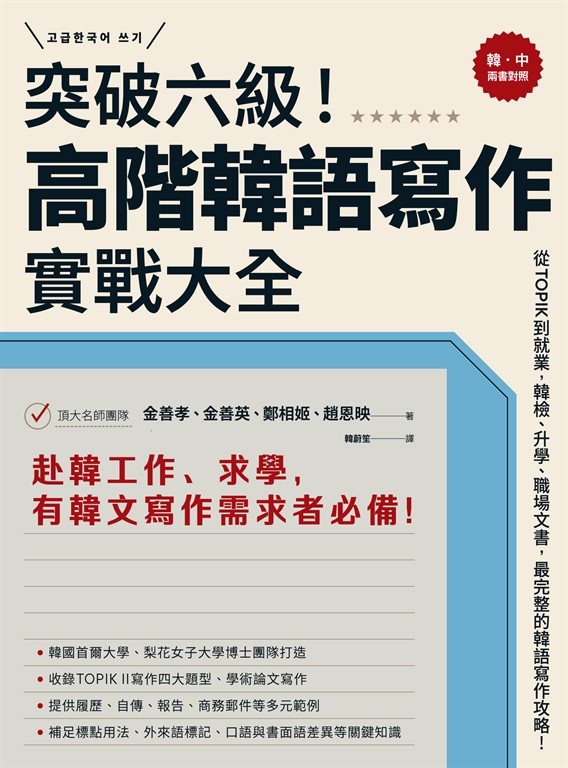 突破六級!高階韓語寫作實戰大全:從TOPIK到就業,韓檢、升學、職場文書,最完整的韓語寫作攻略!(2書+防水書套)