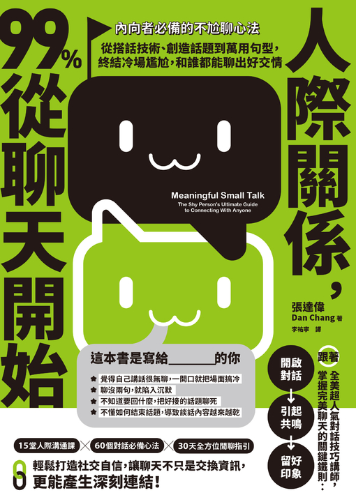 長年的公關經驗,讓她得以近距離觀察成功人士的社交技巧。本書集結她的精闢觀察與親身經驗,不說大道理,只以幽默、一針見血的文字點破「擅長閒聊」和「不擅長閒聊」的人之間的差異,為讀者總結出切實可行、能有效提高聊天能力的技巧。即使是不善言詞的內向者、社恐人也能打開自己,開啟一場有愛的交流、快速融入新環境。