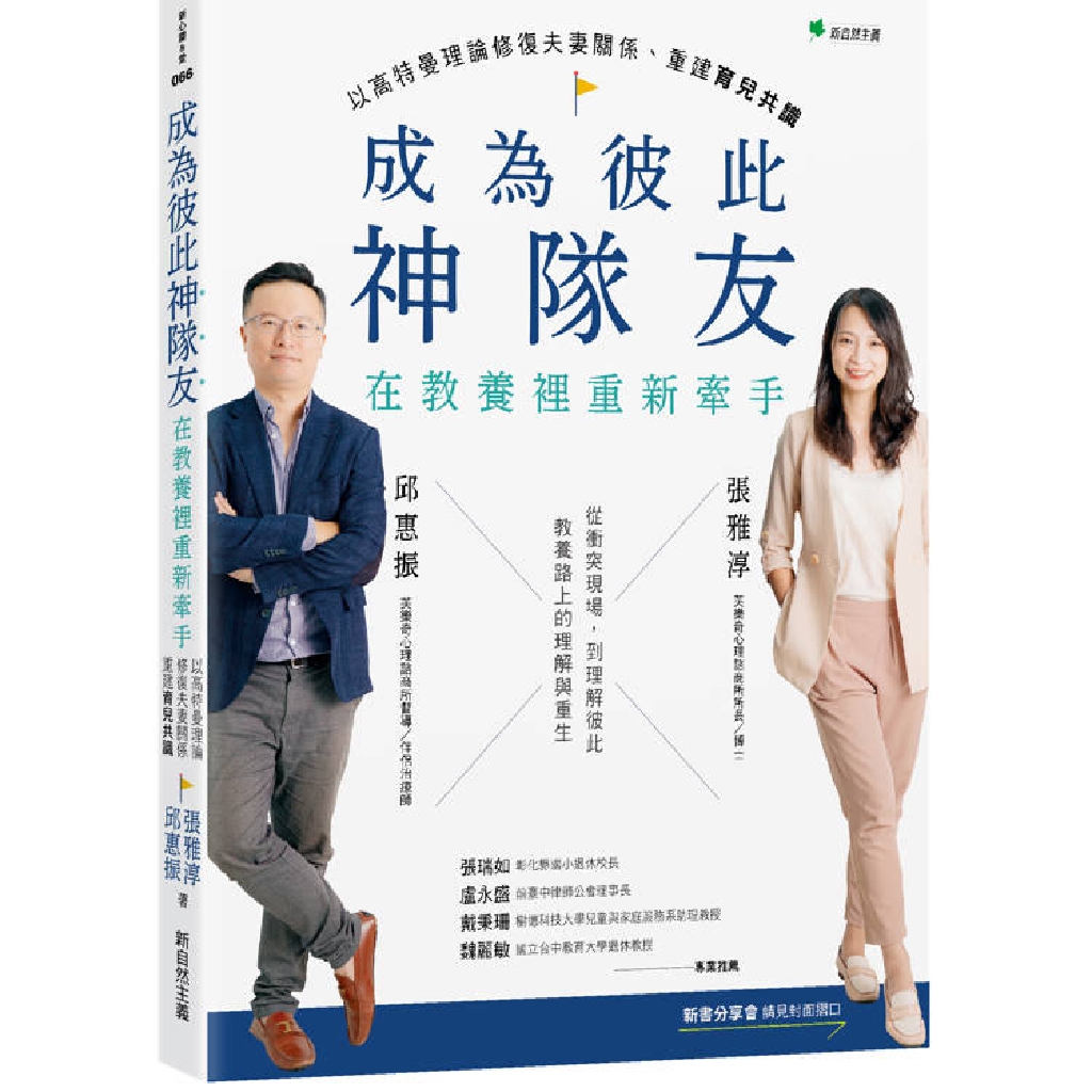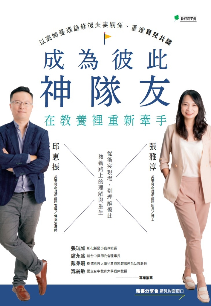 最後,本書作者張雅淳、邱惠振二位心理師將透過建立「家庭儀式」與「關係象徵」,讓教養不再成為夫妻爭執的戰場,而是生活的共同舞台。從「我也會在」到願意承認「我也可能會犯錯」,這些簡單的行動,都是愛的語言。