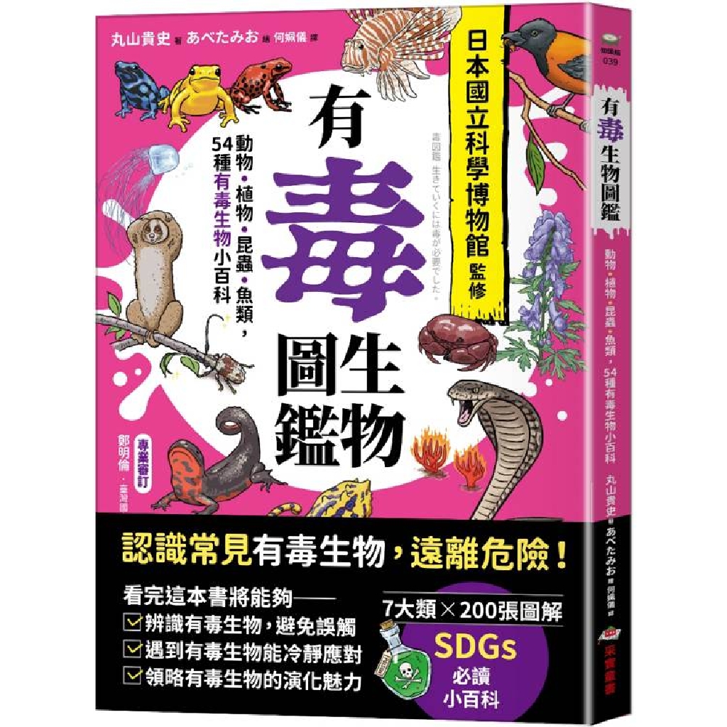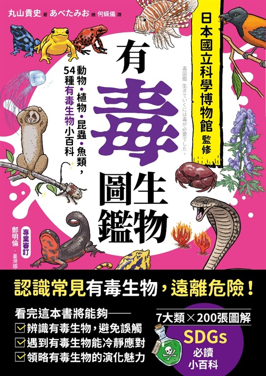 本書以圖鑑形式,收錄爬蟲類、魚類、哺乳類、鳥類等七大類有毒生物,深入了解牠們的外觀特徵、習性、有毒部位等。豐富與實用的知識,滿足小朋友的求知欲。