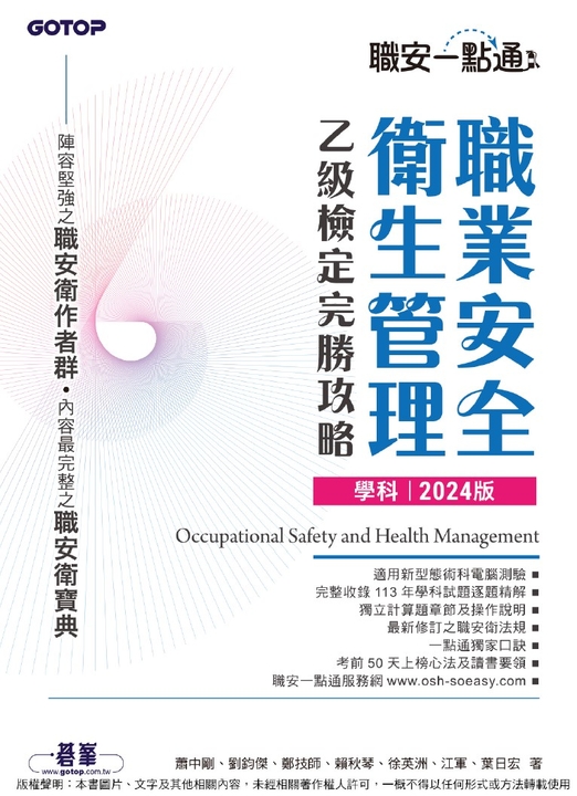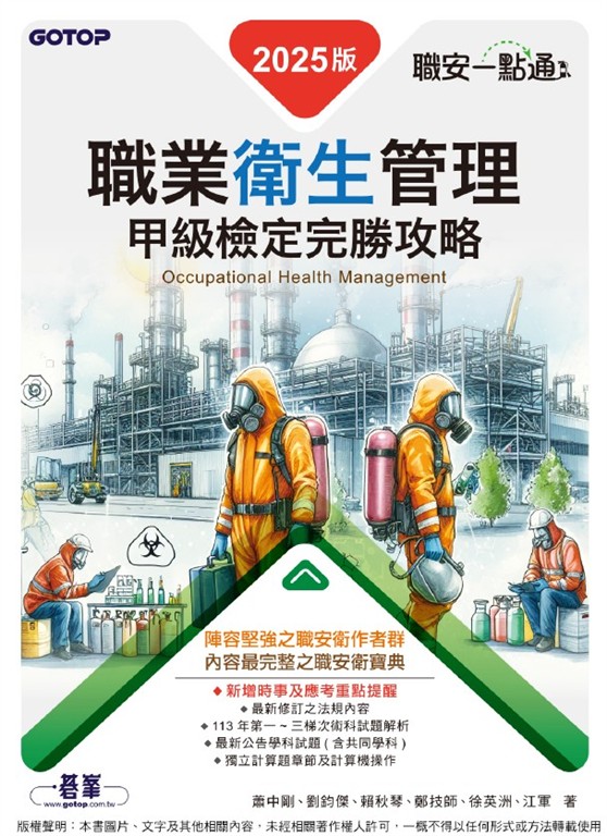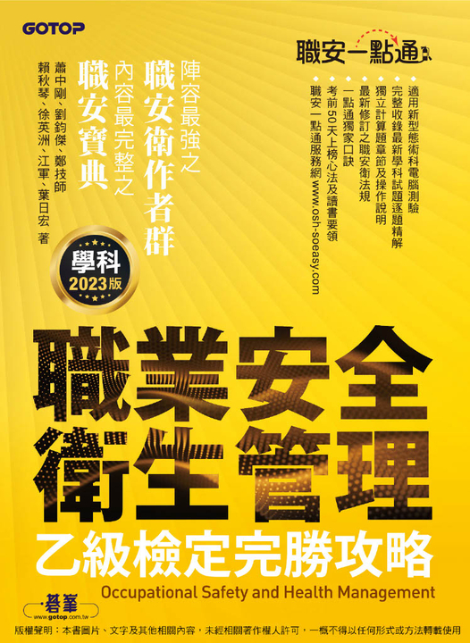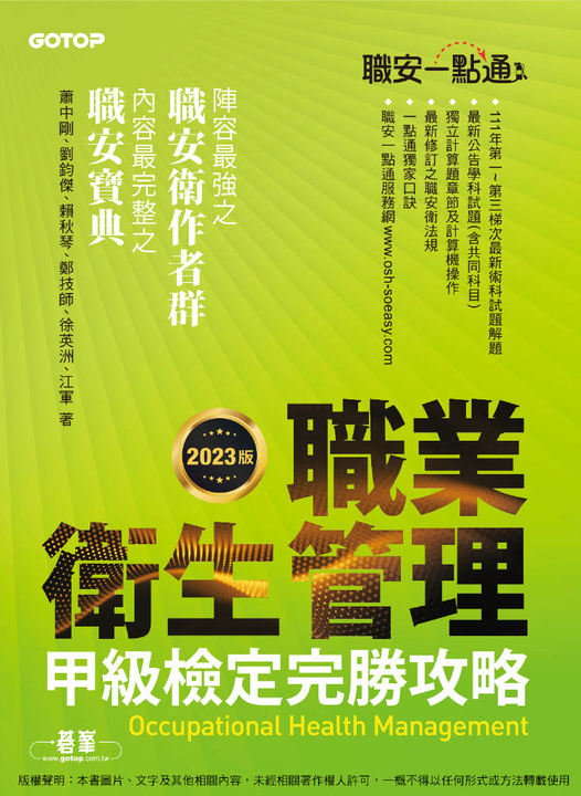 本書作者為職業安全衛生領域最具經驗之專家、名師,結合20年以上教學輔導經驗,上萬名學員口碑保證,合力打造最優質考試參考書籍。