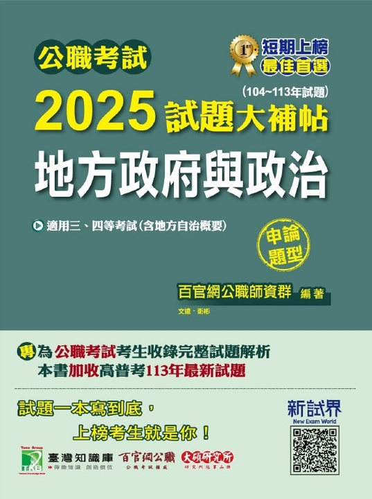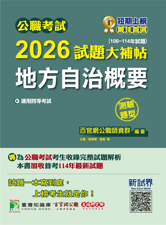 公職考試2026試題大補帖【地方自治概要】(106~114年試題)(測驗題型)[適用四等/普考、地方特考](CK5413)