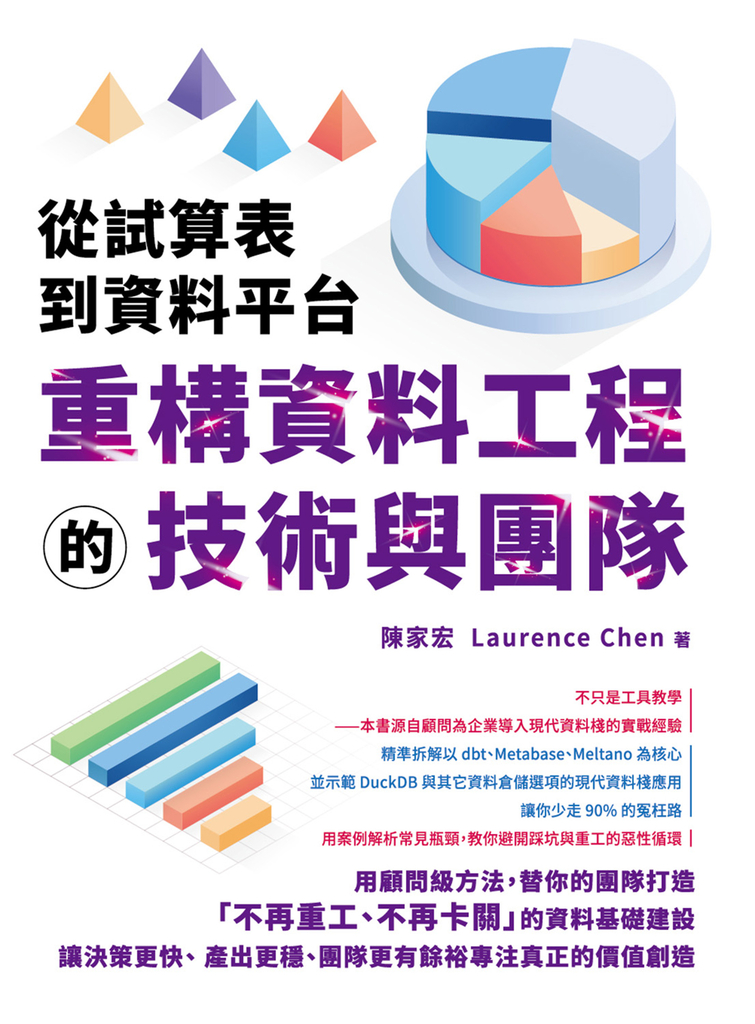 這不是一本教你單一工具操作的書,而是一本幫助你理解「資料基礎建設」背後的思維框架、常見瓶頸、與改進路徑的書。如果你希望節省時間、提升品質、減少重工、甚至把某些原本工程師才能做的事轉交給資料分析師做,那你會在這本書裡找到具體可行的方法論與實踐路徑。