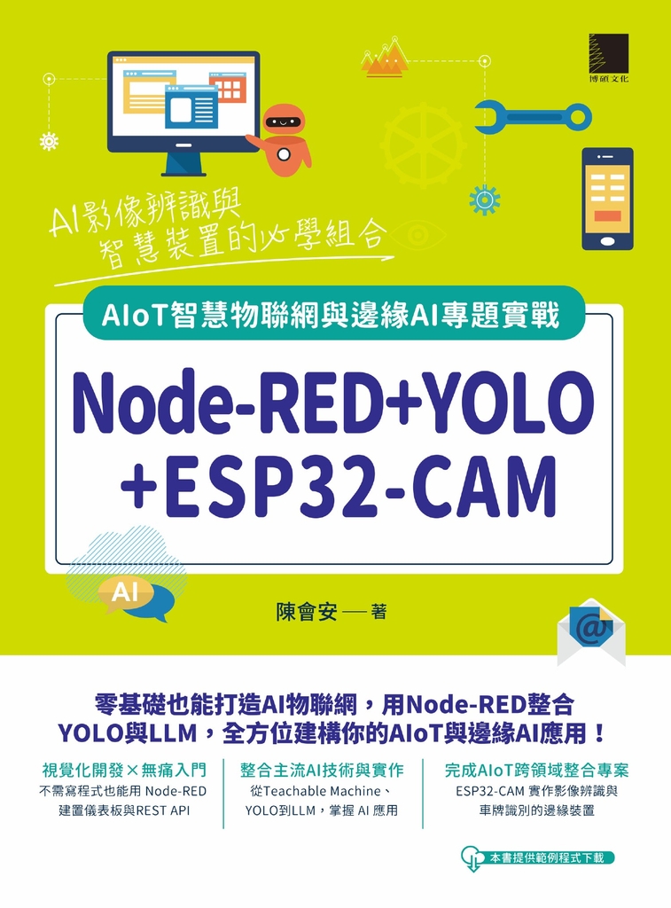 當人工智慧結合物聯網成為未來主流,本書提供一條簡單易學的路徑,帶你從視覺化流程工具Node-RED入門,逐步整合YOLO物體偵測、Teachable Machine影像辨識與LLM大型語言模型,打造出屬於自己的智慧感知系統。全書以圖解+範例方式呈現,並搭配專為本書設計的fChartEasy綠化開發套件,簡化安裝流程快速上手。不論是專題學生、教師或AIoT初學者,都能從中找到有用且完整的解決方案。