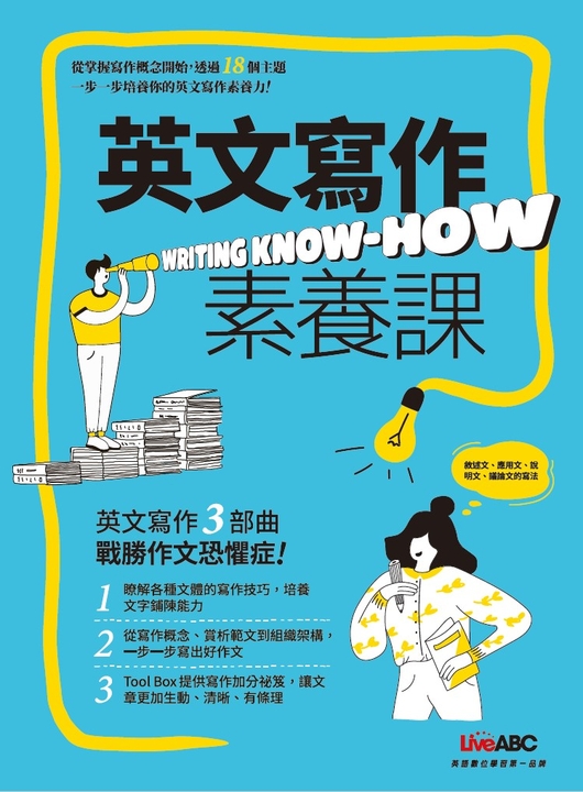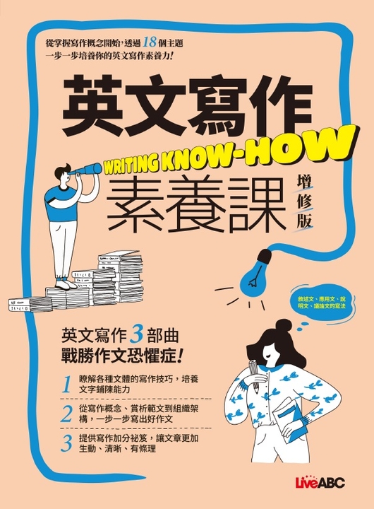 另外特別收錄文法、寫作習慣與標點符號的常見錯誤,協助你避開所有可能誤入的陷阱,該用逗號、分號還是連接詞?什麼時候不能用"tomorrow"要用"the next day"?從寫作格式、固定用法到精準運用近義詞,嚴謹把關所有寫作細節,讓你的作文分數一分都不丟。選擇能讓學習效率倍增的精華模板,讓你用抄的也能寫出帶有自身觀點、條理分明的高分作文!