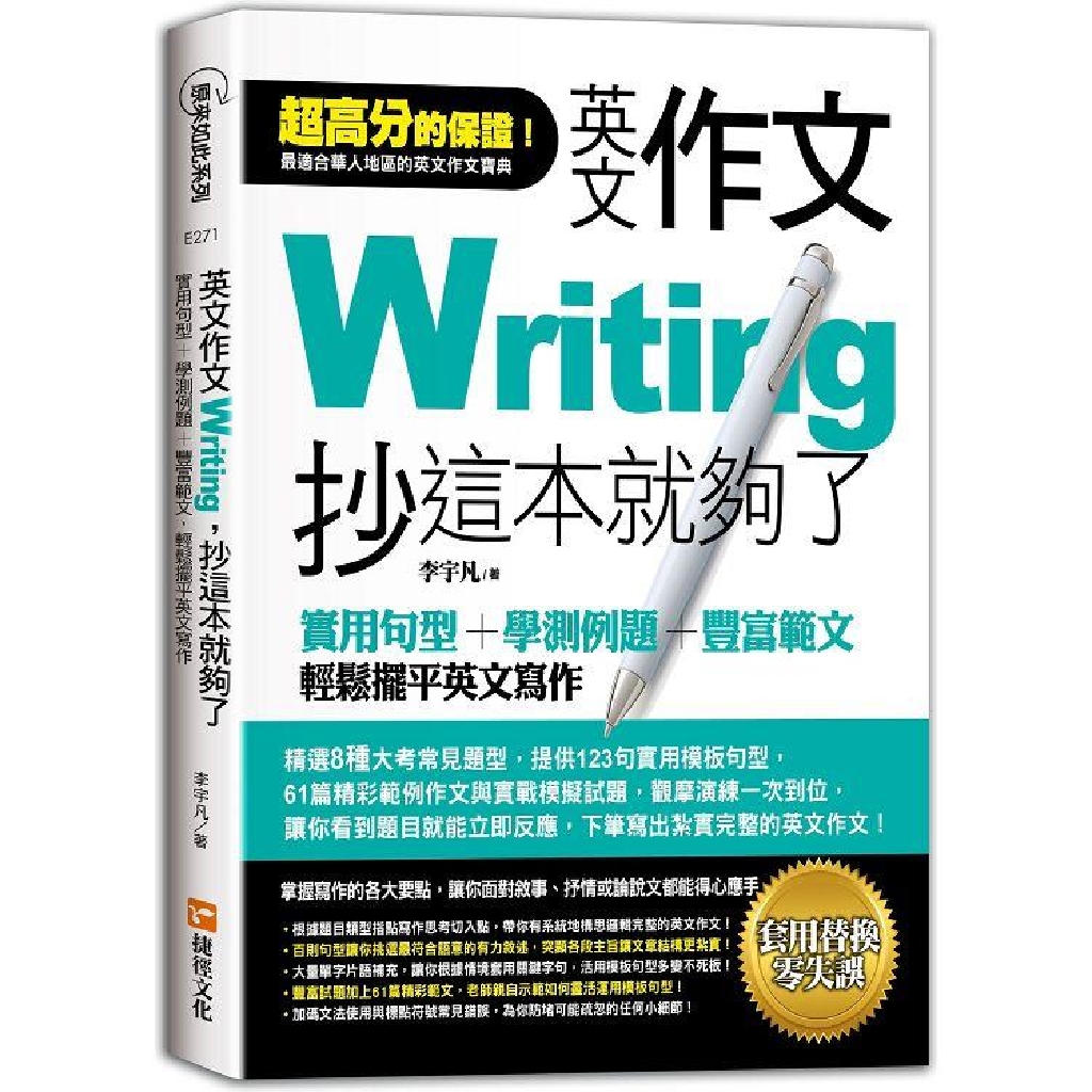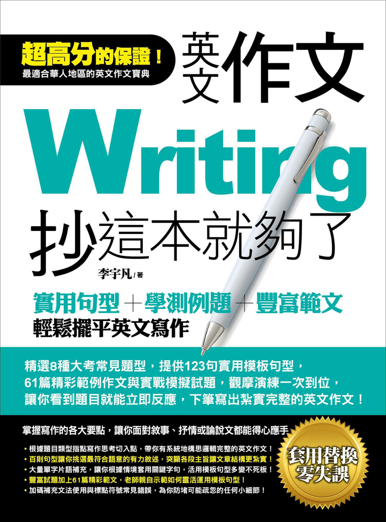 除了上述的例子外,書中一共收錄了8大常見題型╳61篇精彩範例作文╳123句實用句型,