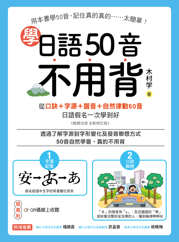 很多希望快速背50音,甚至不惜用諧音法來背,例如背「あ」這個假名,就說它是「阿里山的『阿』」,但這有兩個很大的問題,第一,「あ」的字源是從中文「安」變來的,而不是「阿」,這會讓讀者接受錯誤資訊。第二,很容易「記住聲音但忘了長相」,只記得假名的唸法,但臨時隨便抽一個假名出來卻無法瞬間反應它要怎麼唸。這個狀況也跟用順序背50音表的狀況是一樣的。很多人「あいうえお、かきくけこ」50音表背得很熟,但如果你臨時指一個日文的假名問對方,他會楞一下然後答不出來,或者又要「あいうえお、かきくけこ」的背一遍,背到你抽問的那個假名後才能回答你,而無法達到「看到假名瞬間反應其唸法」的能力。因此,本書設計出了音韻口訣搭唱的記憶法,不但將每個假名唱出來,還將假名發音及假名字源連結在一起,利用假名源自於中文漢字的道理,透過字源培養在腦中浮現出假名長相的能力,消除假名的陌生感,達到字源聯想字形及發音同步完成的神奇記憶效果。你只要負責聽,自然能夠記下日文50音的長相及發音,就這麼簡單!其中更附有幽默有趣的聯想小故事、小故事相關的圖像,讓你在四重刺激下對每個50音的記憶更加清楚,成為達人不是夢。