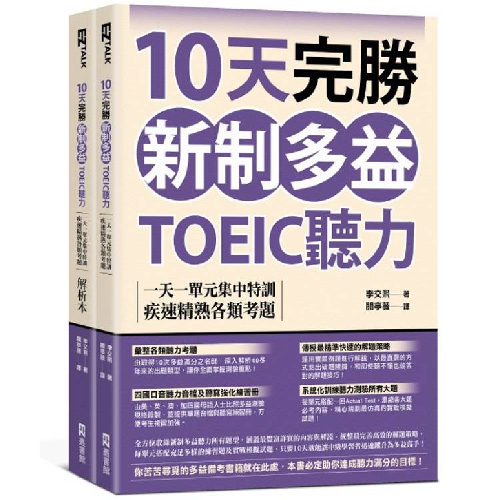 由美、英、澳、加四國母語人士全面依照多益聽力考試規制錄製,可助考生即時熟悉並適應不同國家的發音特點及語調。於解析本隨書附贈加強聽寫訓練專用的練習冊,提供切分音檔方便考生針對特定試題進行演練,於復習的同時快速提升聽力實戰能力。