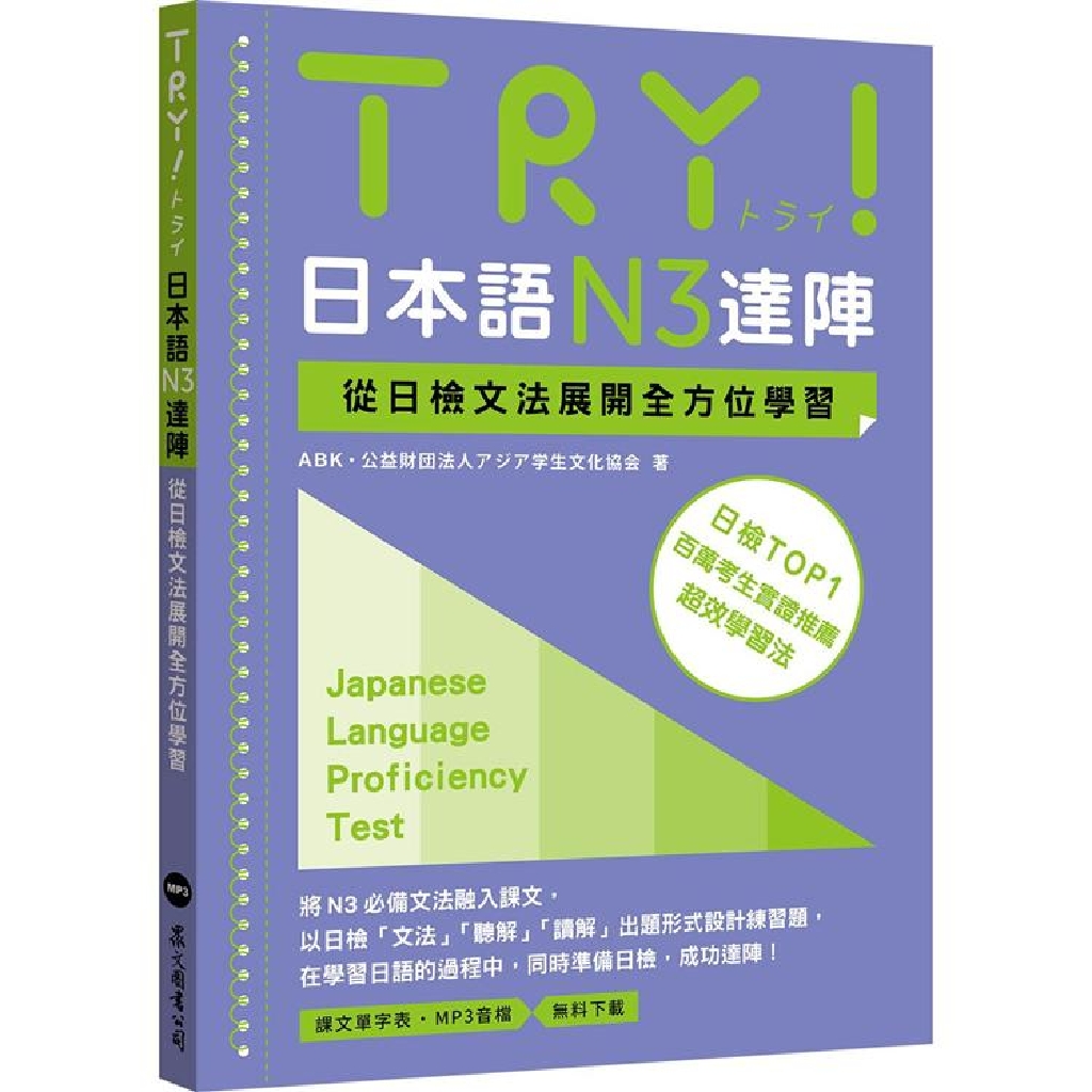 「TRY!日本語能力試験 文法から伸ばす日本語」系列為ABK(公益財団法人アジア学生文化協会)以其35年的日語教育經驗編纂而成。編寫期間,也同時作為旗下日本語學校的授課教材,因而經過實際教學的反覆驗證,是目前將日檢文法整理得最完備的實用教材,讓讀者在學習日語的過程中能同時熟悉日檢題型,事半功倍,深獲第一線教師們高度肯定!