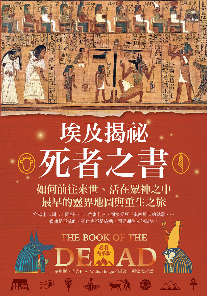 《埃及揭祕.死者之書》由巴吉親自精心選編,保留《死者之書》的精華與關鍵圖像,讓一般讀者能輕鬆讀懂靈魂的冥界通關過程,並系統性地了解《死者之書》為何存在,以及它在埃及社會的重要性和地位,此外,也從「冥王奧西里斯死而復活」神話的傳播,讀懂古埃及人如何看待靈魂和不朽……兼具易讀性、藝術性和宗教導覽價值,是第一次接觸《死者之書》最理想的版本,很適合一般大眾、神祕學與靈性愛好者、文化研究者初探。