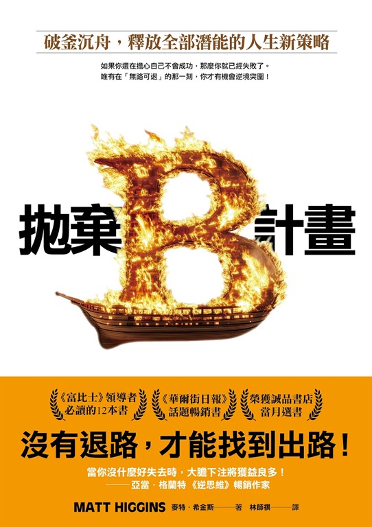 沒有退路,才能找到出路! 《逆思維》暢銷作家 亞當.格蘭特: 「當你沒什麼好失去時,大膽下注將獲益良多!」 《富比士》領導者必讀的12本書! 《華爾街日報》話題暢銷書! 「The Next Big Idea Club」當月選書! 榮獲誠品書店當月選書! Goodread、Amazon讀者直逼★★★★★極致好評! 如果你還在擔心自己不會成功, 那麼你就已經失敗了。 唯有在「無路可退」的那一刻, 你才有機會逆境突圍! ❈ ❈ ❈ 身在資訊爆炸、充滿選擇的時代,我們總是習慣權衡利弊得失,可是求安隱、重保險的結果,卻使人難以確立目標,計畫趕不上變化,只能不停原地踏步。到底我們該怎麼做才好呢?美國傳奇企業家麥特.希金斯說:想要完成偉大的夢想,就要勇於自斷後路、拋棄你的B計畫! 科學研究證實,「擁有太多選項」反而使人難以行動,備用計畫看似周全,卻會削弱我們的決心,成功的人都懂得破釜沉舟,把時間與精力全都灌注在一件事情上。當你勇敢拋棄B計畫,你將不會只是抱持試探的心態,而是懷著必勝的決心,縱使遇到困難,也可以迎難而上,將自己的潛能發揮到極限! 人生最大的風險,就是不敢冒險;想成功的意志有多強,生命的格局就有多大。成功,有時候就是逼出來的,待在不利的位置,其實是我們最大的優勢。只要掌握書中的9大行動策略,不看輕自己,凡事全力以赴,同時學會善用焦慮情緒,就能完美釋放潛能,化逆境為轉機,創造屬於你的非凡人生! ❈ ❈ ❈ 【來自世界的最高讚譽】 麥特.希金斯從經驗得知,當你沒什麼好失去時,大膽下注將獲益良多。他在這本引人入勝又能實際行動的書裡,展現了如何掌控並重塑職涯的方法。――《逆思維》、《隱性潛能》作者/亞當.格蘭特 我討厭B計畫。我總是告訴大家,要實現遠大夢想,就必須忽略來自外部的反對聲音;但如果你有B計畫,你就成了反對自己的聲音。遠大的夢想需要持續保持專注,當你為失敗作計畫,就注定要面對失敗。聽到麥特說是我啟發了他,我真的很感動。最棒的是,這種啟發是可以傳播出去的,而麥特將透過這本書來啟發你。請盡情享受這本書,當你讀完之後,我等不及聽你述說這本書也對誰帶來了啟發。――國際巨星/阿諾.史瓦辛格 麥特有一種稀有的能力,可以清楚表達藏在集體潛意識裡的恐懼。本書精采絕倫,能讓你不再只是追求安穩,並相信自己有能力實現想做的事情,為你夢想的生活奮鬥。在這本書中,你將獲得實用的工具,用來克服自我懷疑,並瞭解人們對你的看法與期望。這本書將改變你!――《僧人心態》作者/傑.謝帝 我發現無論你在職涯的哪一個階段,與其設想接下來會發生什麼事情,最好都能專注在可以學到的事物上。只要能將麥特在書中提出的問題融會貫通,任何人都能更清楚地知道自己的方向。當你讀完這些鼓舞人心的故事後,就能作好準備,並開拓自己的道路。――高盛董事長兼執行長/蘇德巍 如果你正在尋找奮力一搏的動力,本書是你最佳的讀物。麥特是我見過最傑出的企業家與商人之一,從高中輟學到成為哈佛講師,他的人生境遇迫使他甘冒巨大的風險,義無反顧,並為他的職涯帶來了複合式的成功。――Spotify總裁/哈利.芬克爾斯坦 本書講述的不僅是麥特自身的勇氣,以及他令人難以置信的冒險創業歷程,而且還分享了許多信心堅定的企業家們的故事――除了成功,他們別無選擇。本書充滿成功的經驗分享,並鼓勵、引導那些準備好奮力一搏的人。――方舟投資創辦人兼執行長/凱西.伍德 有些人害怕邁出創業的第一步,麥特為你提供了一條挑戰自我的道路,並完成了你可能不敢開始的事情。――知名企業家、NBA達拉斯獨行俠隊老闆/馬克.庫班 我一直都知道,最好的優勢之一就是處於不利地位。生活和工作就是在教我們學會如何跳出框架思考,並將負面因素轉化成積極動能。麥特和我都知道,我們鬥志旺盛的根源就是:我們是在皇后區的街道上長大的。這激發了我們的熱情,並實現不可能的任務。――《創智贏家》共同主演、《紐約時報》暢銷作家/戴蒙.約翰 麥特.希金斯的觀點非常勵志且鼓舞人心——我這本《拋棄B計畫》的書頁上,已經畫滿了重點標記。――美國知名室內設計師、Magnolia Homes創辦人、作家/喬安娜.蓋恩斯 【各界名家強力推薦】 【《逆思維》、《隱性潛能》作者】亞當.格蘭特 【國際巨星】阿諾.史瓦辛格 【《僧人心態》作者】傑.謝帝 【高盛董事長兼執行長】蘇德巍 【Spotify總裁】哈利.芬克爾斯坦 【方舟投資創辦人兼執行長】凱西.伍德 【知名企業家、NBA達拉斯獨行俠隊老闆】馬克.庫班 【《創智贏家》共同主演、《紐約時報》暢銷作家】戴蒙.約翰 【美國知名室內設計師、Magnolia Homes創辦人、作家】喬安娜.蓋恩斯 【「閱讀前哨站」站長】瓦基 【臨床心理師】洪仲清 【成大教授.《自己的力學》、《先降噪,再聚焦》作者】洪瀞 【諮商心理師、暢銷作家】陳志恆 【超級業務商學院執行長】張邁可 【社群玩家】電商人妻Audrey 【超業級講師、行銷表達技術專家、Podcast銷幫幫主】解世博 【鉑澈行銷顧問策略長】劉奕酉 一致盛讚 ●中文推薦人依姓名筆畫序排列