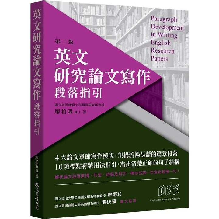 廖柏森教授的「英文研究論文指引」系列一套六本,分別從關鍵句、文法、搭配詞、段落、口語報告及摘要六個主題,結合理論與實務,兼顧深度與廣度,指引寫作者從點線面發展出一篇英文論文,是每位有撰寫英文論文需要的學術工作者不可或缺的案頭書。
