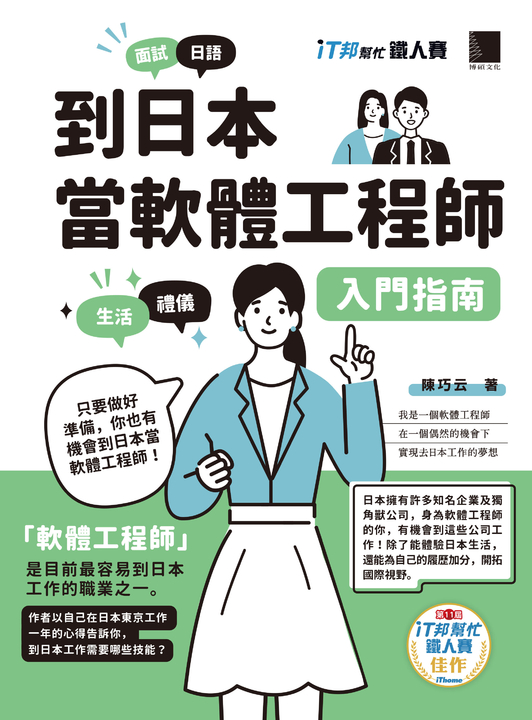 本書內容改編自第11屆iT邦幫忙鐵人賽Software Development組佳作系列文章──《到日本當軟體工程師的入門指南》。作者從小喜歡日本文化及到日本旅遊,一直有到日本生活的小小夢想。在公家機關擔任工程師五年,一次機緣中獲得到日本IT公司工作的面試機會,並通過面試獲取工作簽證,飛到日本東京生活。工作期間在部落格紀錄自己到日本生活的點滴,有網友來詢問日本工作的相關細節,因此決定撰寫到日本工作的完全攻略!內容包含日本工程師的薪資水準、日本稅金和生活費估算,以及履歷、面試準備、Relocate的流程與注意事項,及日本職場經驗談、食衣住行等在日生活實況分享。此書適合喜愛日本,想到日本闖一闖的朋友。
