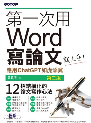 紙本書 第一次用Word寫論文就上手(第二版)|應用ChatGPT如虎添翼 碁峰資訊 黃聰明 第一次用Word寫論文就上手(第二版)∣應用ChatGPT如虎添翼 碁峰資訊 黃聰明 eBook NT$650 Printed book NT$513 Preview eBook DRM NT$650 Printed book NT$513