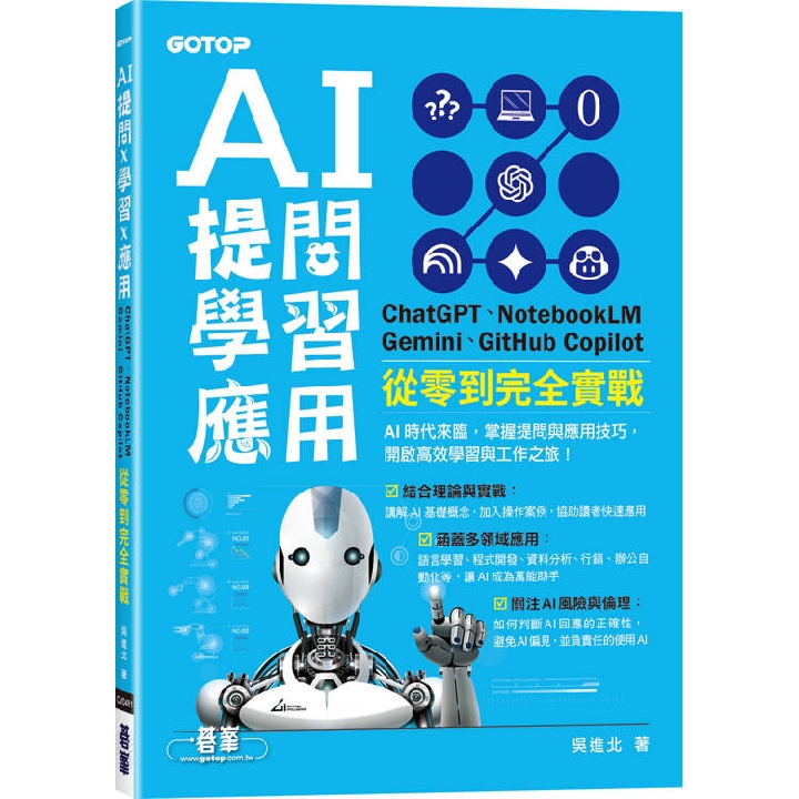 紙本書 AI 提問 X 學習 X 應用:ChatGPT、NotebookLM、Gemini、GitHub Copilot從零到完全實戰 碁峯資訊 吳進北 AI 提問 X 學習 X 應用:ChatGPT、NotebookLM、Gemini、GitHub Copilot從零到完全實戰 碁峯資訊 吳進北 eBook NT$390 Printed book NT$308 Preview eBook DRM NT$390 Printed book NT$308
