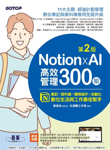 紙本書 Notion X AI高效管理300招(第二版):筆記×資料庫×團隊協作×自動化,數位生活與工作最佳幫手 碁峰資訊 鄧君如 總監製 文淵閣工作室 編著 Notion X AI高效管理300招(第二版):筆記×資料庫×團隊協作×自動化,數位生活與工作最佳幫手 碁峰資訊 鄧君如(總監製) eBook NT$560 Printed book NT$442 Preview eBook DRM NT$560 Printed book NT$442