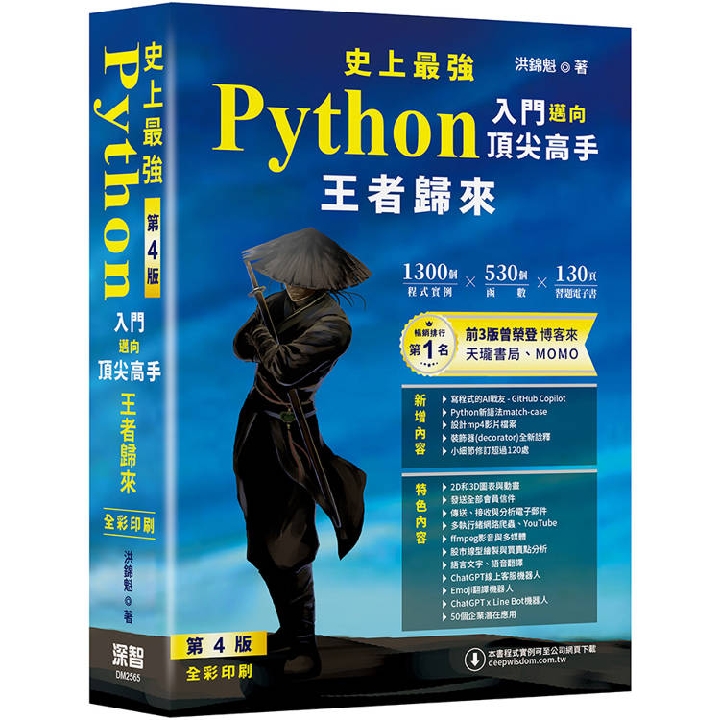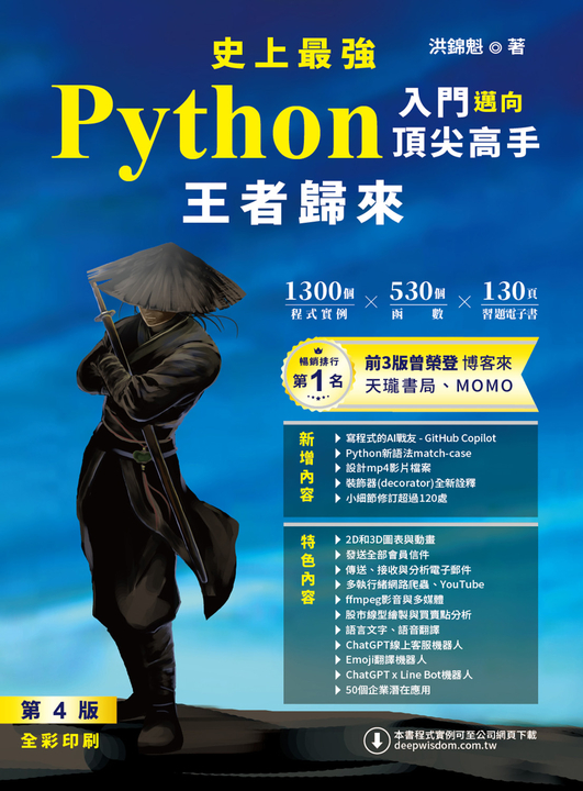 紙本書 史上最強Python入門邁向頂尖高手:王者歸來 深智數位股份有限公司 洪錦魁 史上最強Python入門邁向頂尖高手 - 王者歸來 第4版(全彩印刷) 深智數位股份有限公司 洪錦魁 eBook NT$960 Printed book NT$1080 Preview eBook DRM NT$960 Printed bookOut of stock NT$1080